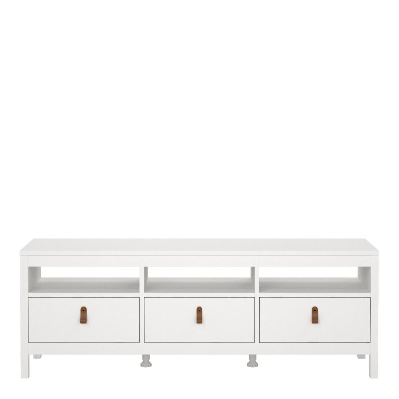 Original price was: £336.02.£268.82Current price is: £268.82. Add to basketA spacious and modern TV Unit in a crisp White finish, featuring three open media cubbies and three large storage drawers. Defined by its unique brown leather tab handles and clean Scandinavian lines, it is built from durable, scratch-resistant laminated board. With integrated cable management and a wide $151 text{ cm}$ profile, it is the ideal centerpiece for a contemporary home cinema setup.