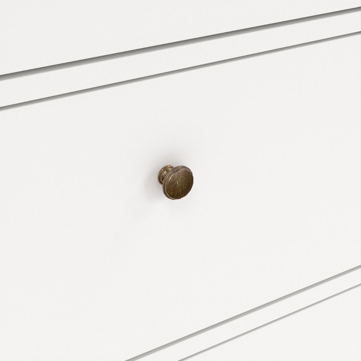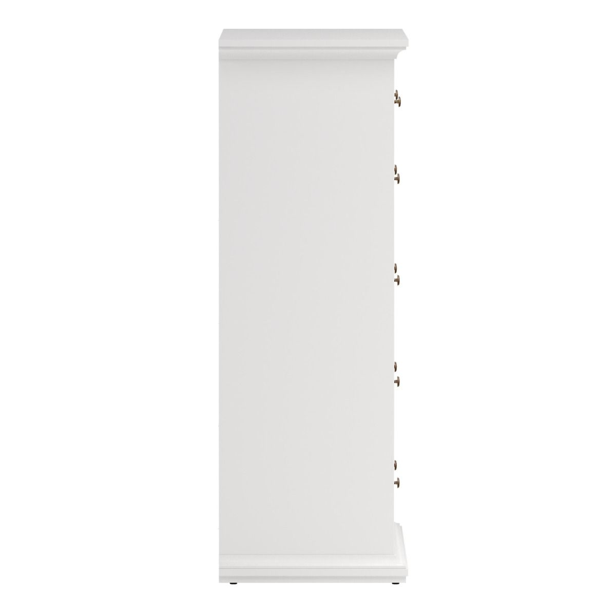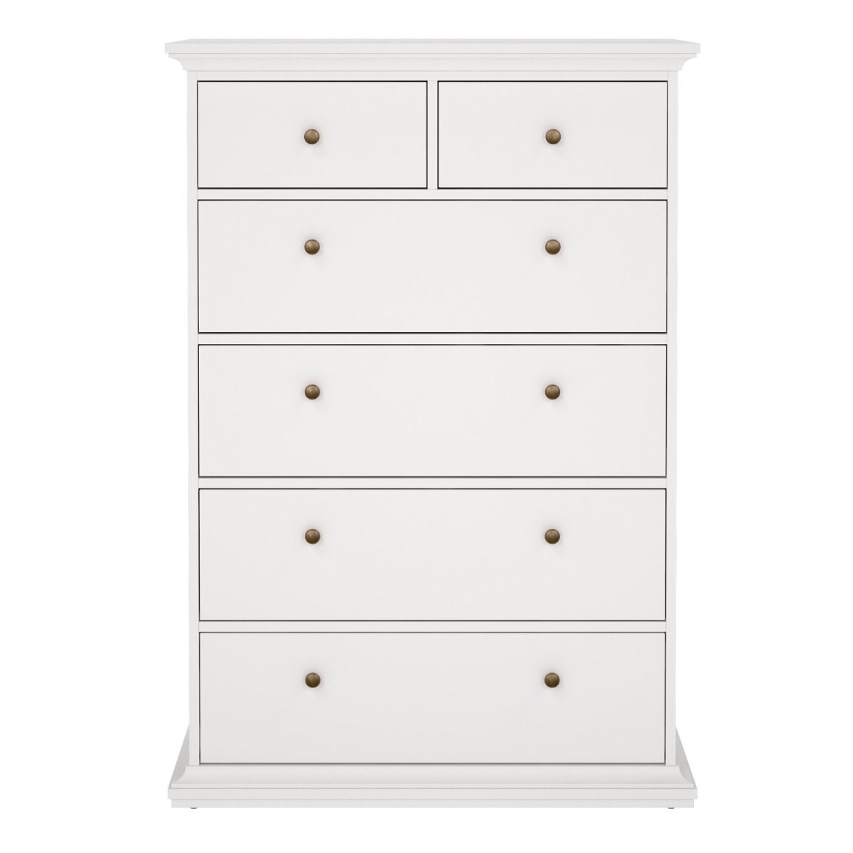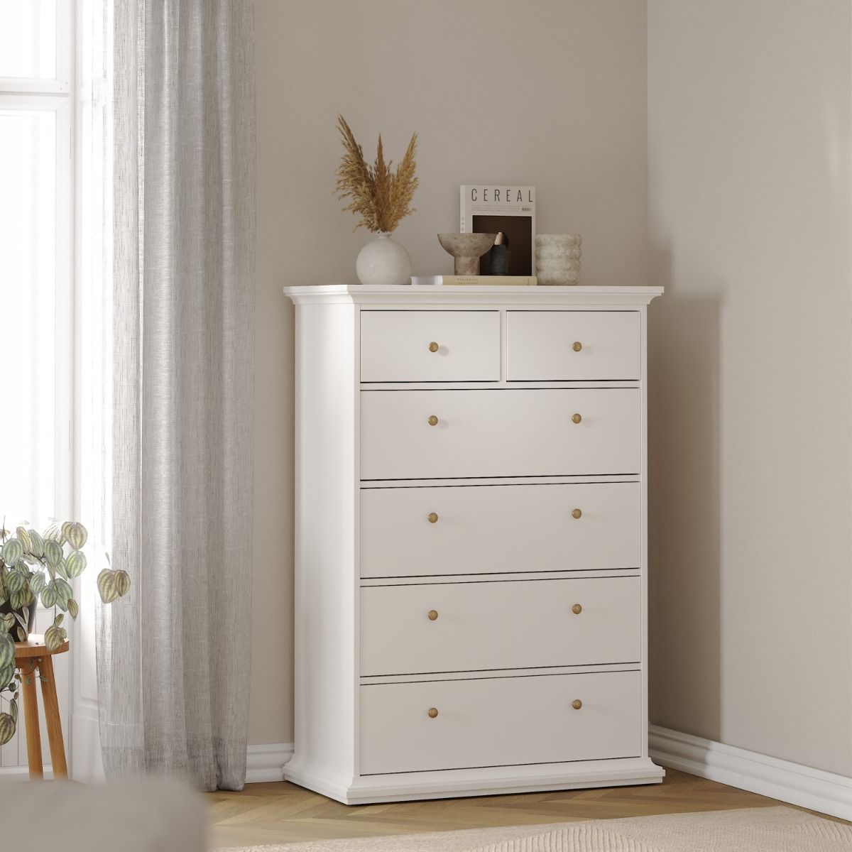 The Paris Chest of 6 Drawers is a substantial piece of bedroom furniture, providing extensive horizontal storage and a large top surface, making it highly functional and a prominent feature in a dressing area.Design and Aesthetics:Finish: Features a clean, uniform White finish, usually a durable laminate or high-quality foil/lacquer, which provides a bright, versatile, and easily maintained surface.Structure: Designed as a wide, medium-height chest (a double dresser), offering a large horizontal expanse of storage space.Configuration: The six drawers are typically arranged in a 3 over 3 format (three top drawers over three bottom drawers), allowing for excellent organization and segregation of various clothing types.Style: Maintains a classic and transitional design with clean lines. It usually includes traditional metal handles (often in a silver or chrome finish) that offer a subtle, elegant contrast to the white fronts.Functionality and Storage:Six Drawers: Provides a generous six drawers, offering immense capacity for organizing a large volume of folded clothing, accessories, or linens.Top Drawers (3): Ideal for smaller items like underwear, socks, or accessories.Lower Drawers (3): Suitable for bulkier items like sweaters, t-shirts, and trousers.Drawer Mechanisms: Drawers are fitted with smooth, reliable metal runners for effortless operation, even when drawers are heavily utilized.Surface Area: The wide top surface is ideal for use as a dressing table (accommodating a mirror and jewelry box) or for displaying a television, lamps, and decorative collections.Construction and Durability:Constructed from durable laminated board (MDF or high-quality particleboard).The laminated surface is engineered to be resistant to scratches, moisture, and general wear, ensuring the chest is easy to clean and maintains its appearance over time.The wide, sturdy structure is built for stability and is often supplied with wall-fixing straps for safety.The unit is supplied flat-packed with all necessary instructions for self-assembly.Approximate Dimensions (Wide Double Dresser):Width (W): $approx 120 text{ cm}$ to $140 text{ cm}$Height (H): $approx 77 text{ cm}$ to $82 text{ cm}$Depth (D): $approx 40 text{ cm}$ to $43 text{ cm}$Assembled Weight: $approx 60 text{ kg}$ to $70 text{ kg}$