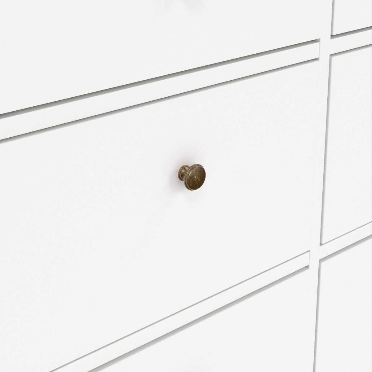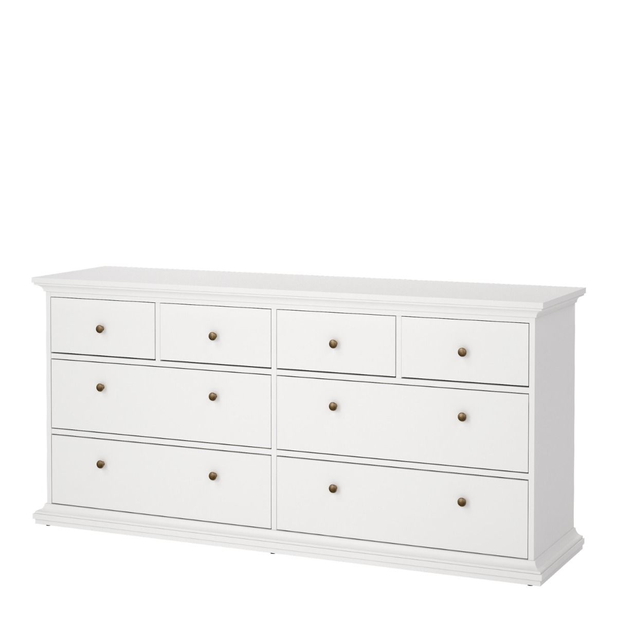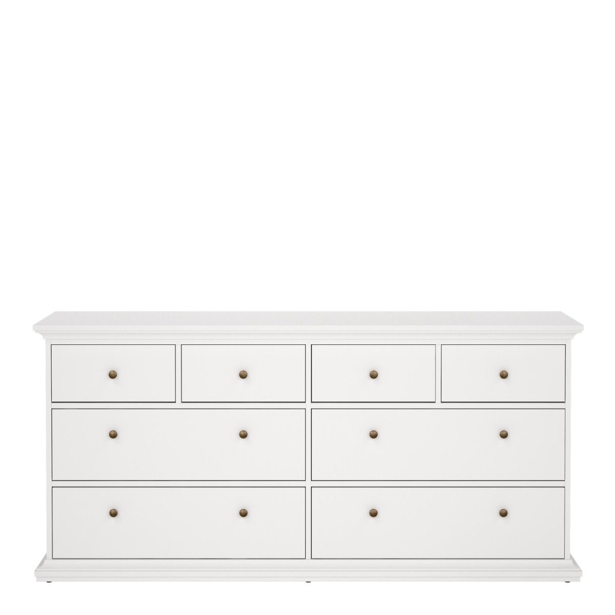The Paris Chest of 8 Drawers is a highly substantial and prominent piece of bedroom furniture, offering the largest horizontal storage capacity in the collection while maintaining the clean, elegant aesthetic of the Paris range.Design and Aesthetics:Finish: Features a uniform, crisp White finish, typically a durable laminate or high-quality foil/lacquer, which provides a bright, versatile, and easily maintained surface.Structure: Designed as an extra-wide, medium-height chest, often spanning the majority of a wall space, making it a functional focal point.Configuration: The eight drawers are usually arranged in a 4 over 4 format (four top drawers stacked over four bottom drawers), creating extensive and symmetrical storage options.Style: Maintains a classic and transitional design with clean lines. It includes traditional metal handles (often silver or chrome) on all eight fronts, contributing to its elegant, detailed appearance.Functionality and Storage:Eight Drawers: Provides exceptional storage capacity, allowing for meticulous organization and segregation of all types of clothing, linens, and accessories.Top Drawers (4): Ideal for smaller, frequently accessed items like socks, accessories, jewelry, or undergarments.Lower Drawers (4): Suitable for bulkier items such as sweaters, jeans, t-shirts, and seasonal clothing.Drawer Mechanisms: Drawers are fitted with smooth, reliable metal runners for effortless and consistent operation, even when bearing heavy loads.Surface Area: The extra-wide top surface is highly functional, serving as a vast dressing table (accommodating a large mirror and ample cosmetics) or for displaying a wide-screen television, lamps, and extensive decorative arrangements.Construction and Durability:Constructed from durable laminated board (MDF or high-quality particleboard).The laminated surface is engineered to be resistant to scratches, moisture, and general wear, ensuring the chest is easy to clean and maintains its appearance over time.The wide, heavy structure is built for superior stability and is strongly recommended to be secured to the wall using provided anti-tipping straps.The unit is supplied flat-packed with clear instructions for self-assembly.Approximate Dimensions (Extra Wide Double Dresser):Width (W): $approx 160 text{ cm}$ to $180 text{ cm}$Height (H): $approx 80 text{ cm}$ to $90 text{ cm}$Depth (D): $approx 40 text{ cm}$ to $43 text{ cm}$Assembled Weight: $approx 80 text{ kg}$ to $90 text{ kg}$