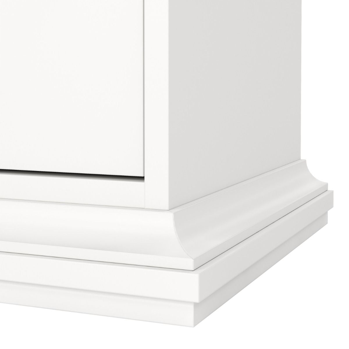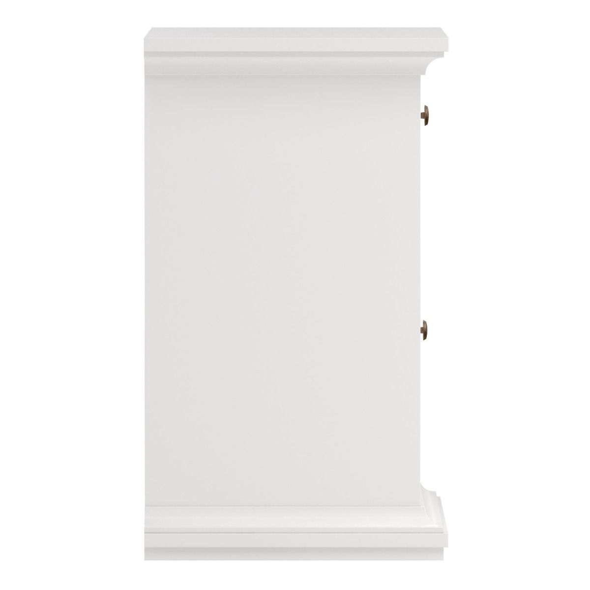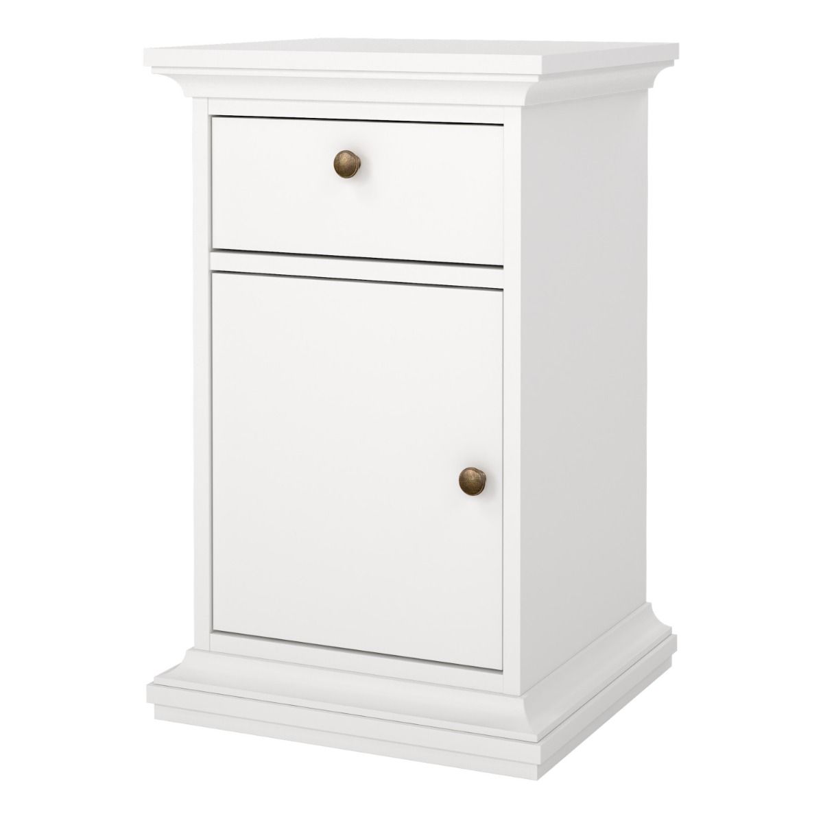 The Paris Nightstand is a practical and small-scale piece of furniture, offering immediate access to nighttime essentials while maintaining a tidy and elegant appearance in the bedroom.Design and Aesthetics:Finish: Features a clean, uniform White finish, typically a durable laminate or a smooth foil/lacquer, providing a bright, easily matched, and versatile look.Structure: Designed as a compact bedside unit, fitting comfortably next to the bed without taking up excessive floor space.Style: Maintains the classic and transitional design of the Paris collection, with simple, clean lines. It includes a traditional metal handle (often silver or chrome) on both the drawer and the door, adding a subtle touch of elegance.Base: Usually sits on a small plinth or discreet feet for stability.Functionality and Storage:One Drawer: Positioned at the top, this drawer provides convenient, concealed storage for small items like medications, reading glasses, chargers, or jewelry.One Door Cupboard: Beneath the drawer, a single door opens to a larger cupboard space, often with a single internal shelf, which is ideal for storing books, magazines, tissues, or extra blankets.Drawer Mechanism: The drawer is mounted on smooth, reliable metal runners for easy operation.3Top Surface: Offers sufficient space for a bedside lamp, alarm clock, or drinks.Construction and Durability:Constructed from durable laminated board (MDF or high-quality particleboard).4The laminated surface is engineered to be resistant to scratches, moisture, and general wear, ensuring the nightstand is robust and easy to clean.5The structure is built to be sturdy and reliable for everyday use.The unit is supplied flat-packed with all necessary instructions for self-assembly.6Approximate Dimensions (Compact Nightstand):Width (W): $approx 40 text{ cm}$Height (H): $approx 60 text{ cm}$Depth (D): $approx 40 text{ cm}$Assembled Weight: $approx 15 text{ kg}$