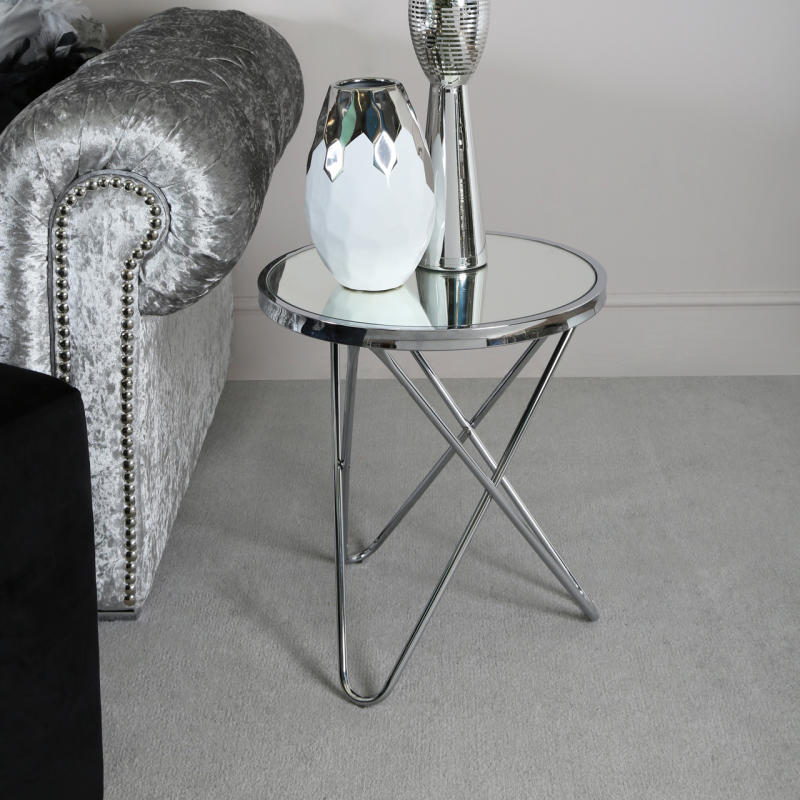 With its reflective surfaces and sculptural chrome frame, it serves as both a functional side table and a bold statement piece.
