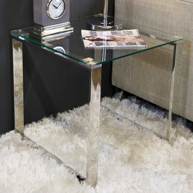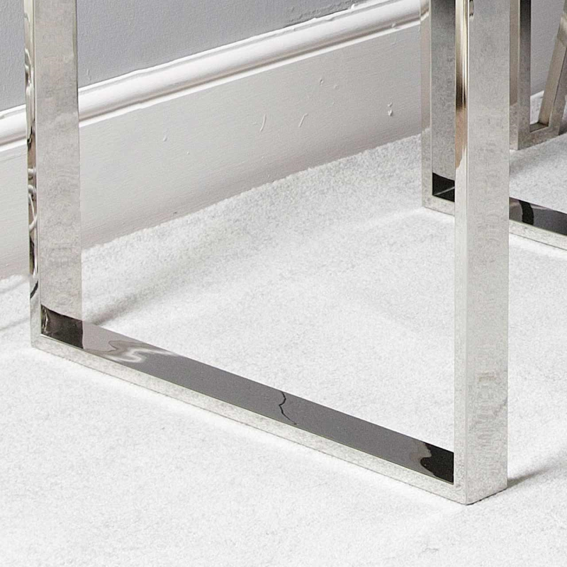 The polished chrome finish gives the table a mirror-like shine, enhancing light and visual space in the room.