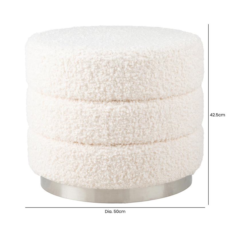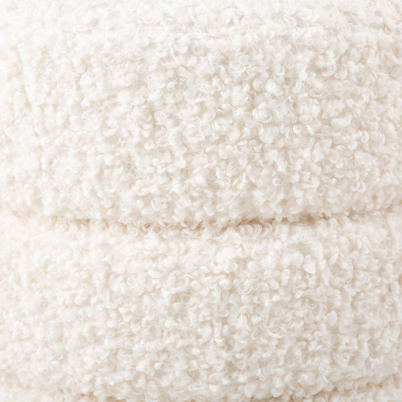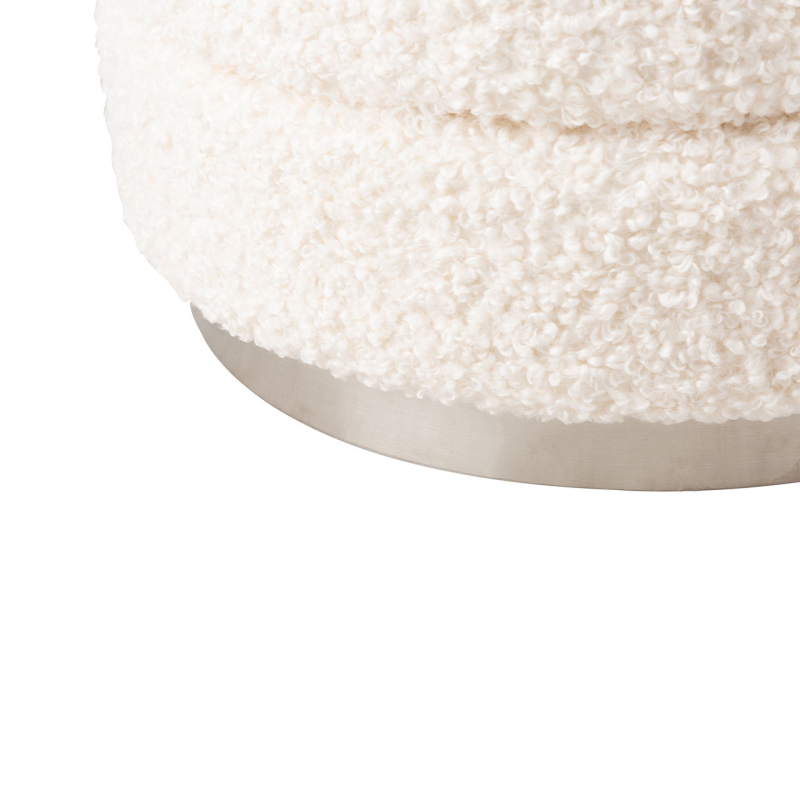 Wrapped in white boucle fabric, known for its soft, nubby texture and elegant, cloud-like look.
