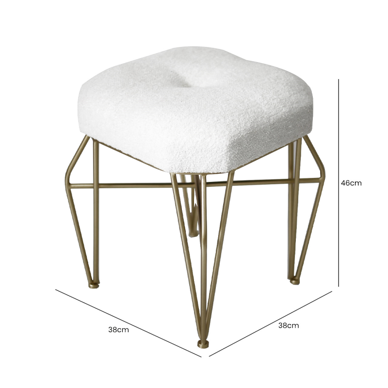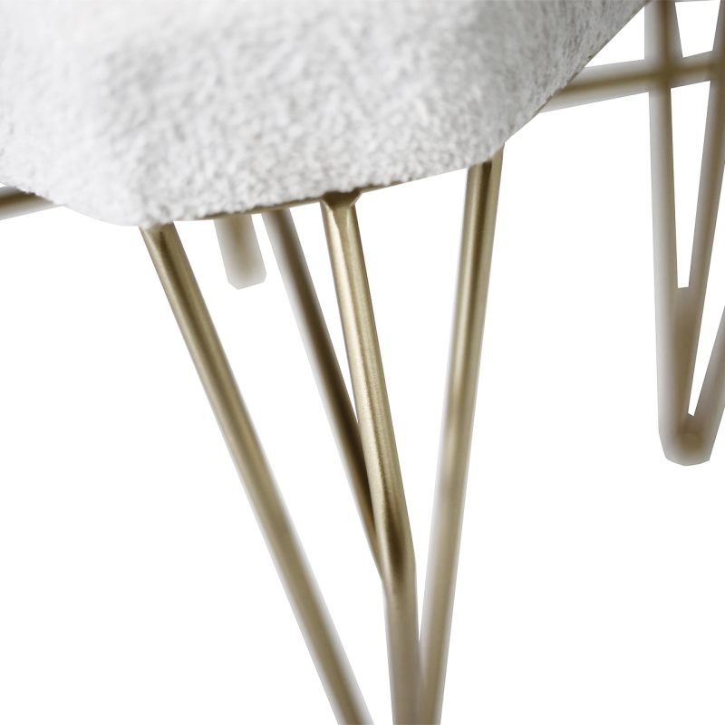 The mix of boucle texture and gold metal creates a balanced blend of warmth and luxury.