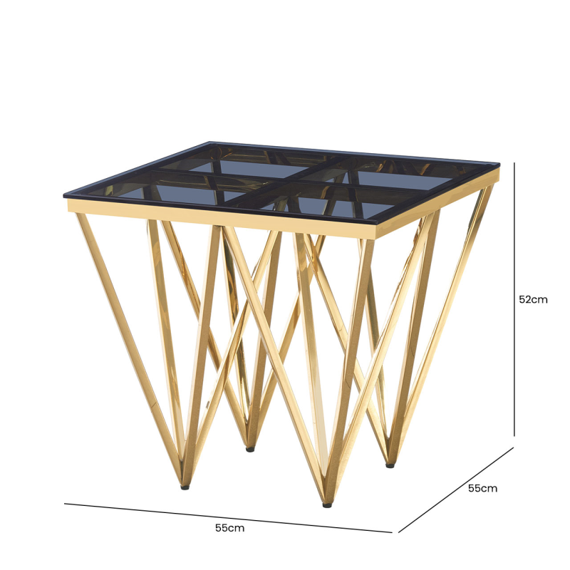 The Gold Metal End Table with Smoked Glass Top offers a sophisticated mix of warm metallic tones and rich glass detailing, perfect for elevating any modern or contemporary space.