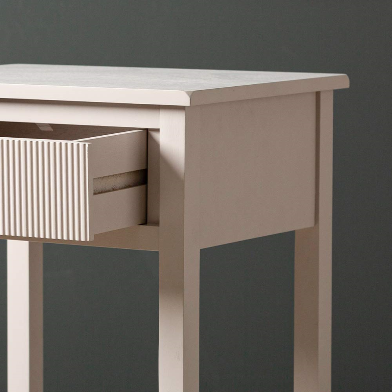 The brushed metal drawer handle adds a modern touch, complementing the table?s clean design.
