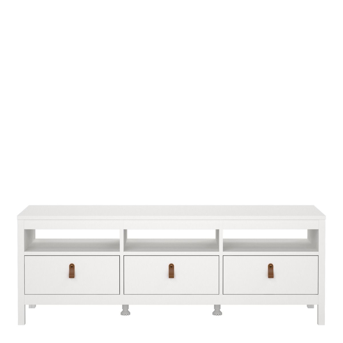 Layout: The unit is divided horizontally. The top section consists of three open cubbies (niches) for media devices, while the bottom section features three spacious drawers.