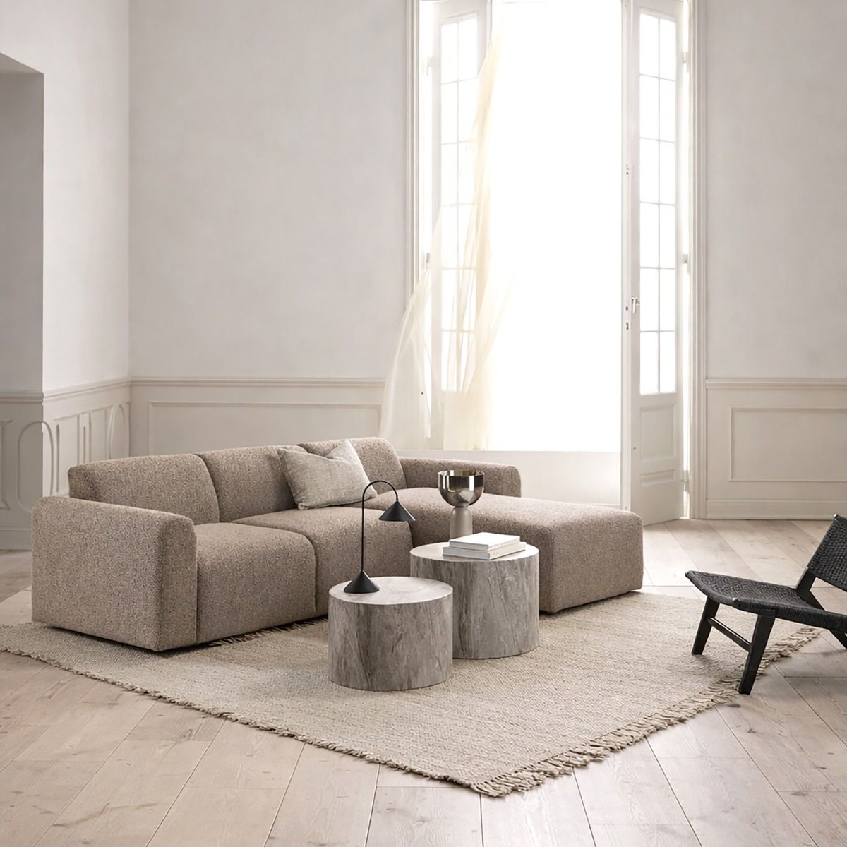 The Midfield Right Hand Facing 2 Seater Chaise Longue in Boucle Beige Fabric is a modern and elegant seating option designed to add comfort, style, and functionality to your living space. With its contemporary silhouette and luxurious textured upholstery, this sofa makes a perfect centrepiece for any modern living room.